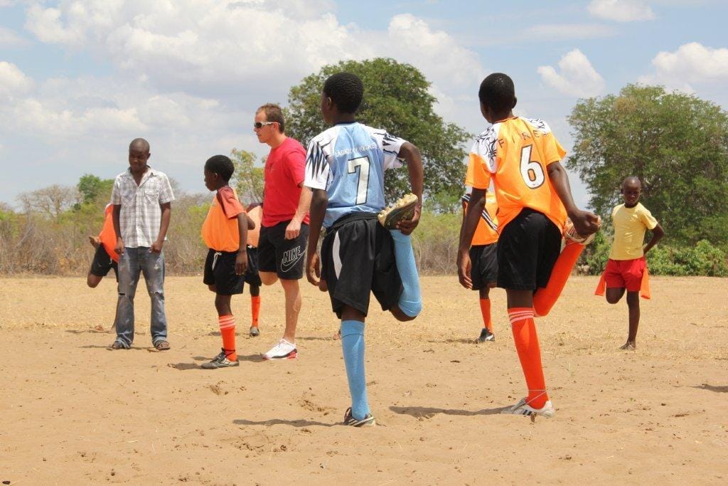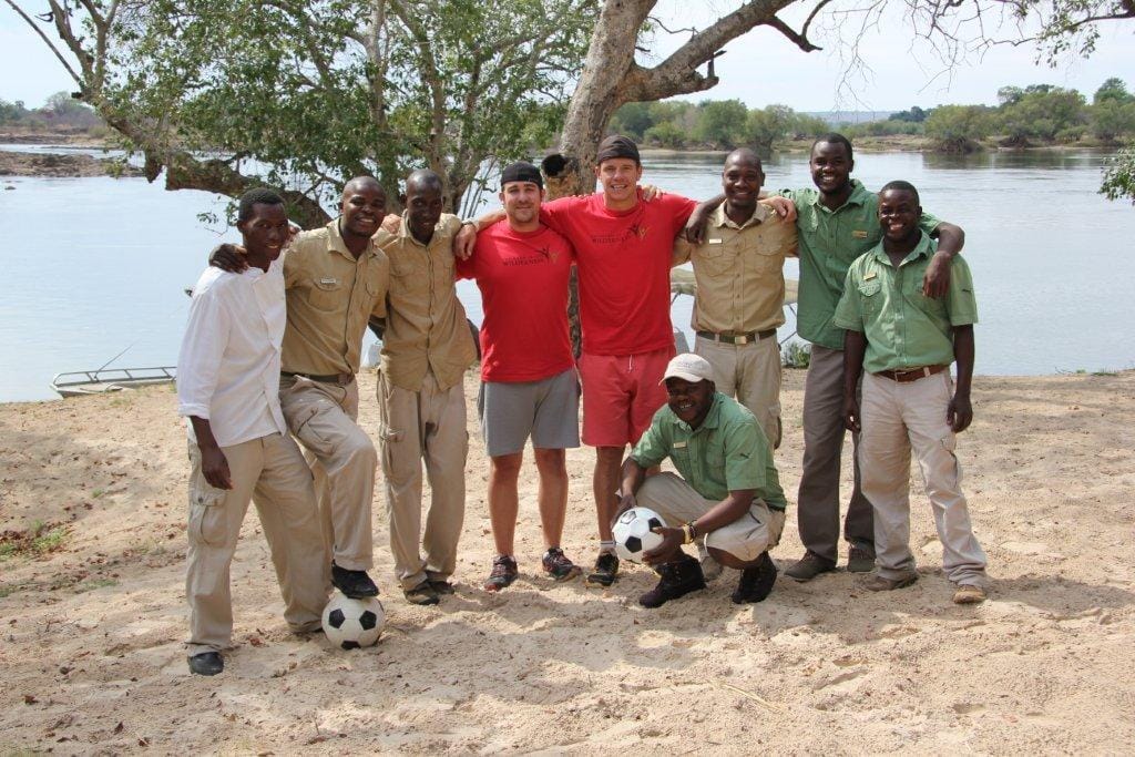 With Wilderness Safaris staff at Toka Leya, Zambia; Warming up for the final match at Jabulani School in Zimbabwe