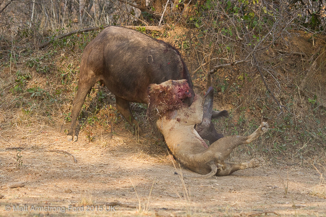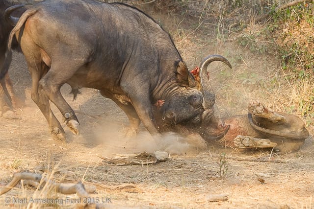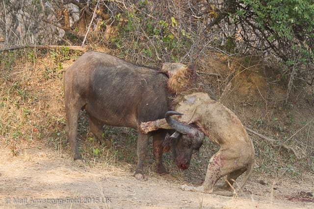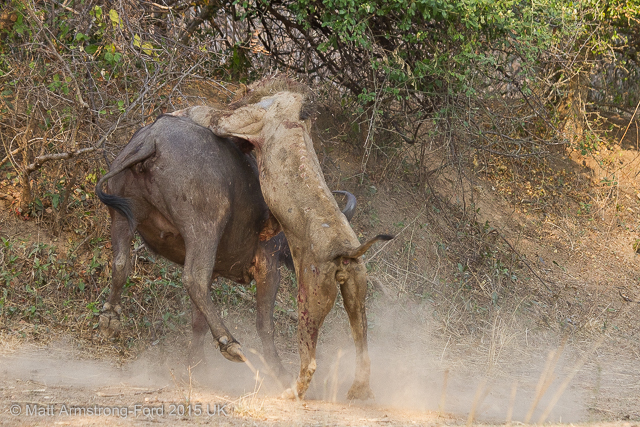 A few days later he still had not moved from the Mwamba hide and was looking weaker and weaker by the day until Wednesday when we got a call on the radio from Vickson saying there was a commotion coming from the hide. We arrived at the hide to find the Mwamba male hanging from the muzzle of another female buffalo whilst the rest of the herd watched on. What followed can only be described as an epic battle between two gladiators fighting to the death.