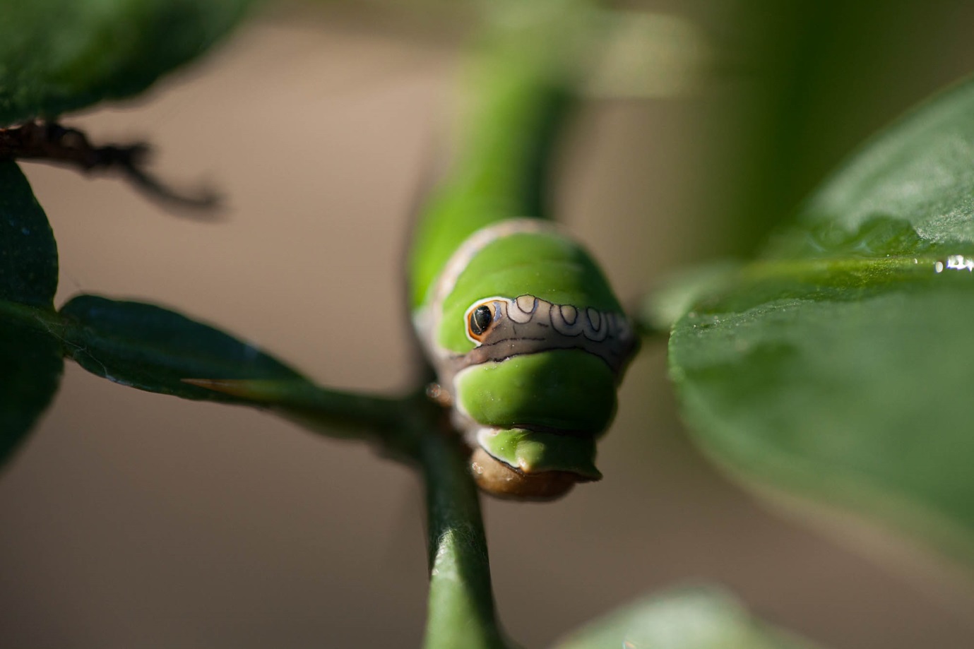 “So where to start, well I guess we should work our way up the ladder from small to big so check out this rather funky looking caterpillar we spotted with those huge eyes staring out at us. I have however been corrected that whilst we don’t have an exact identification we suspect it was a hawk moth larvae. He was rather strange and when I got closer a tongue was stuck out at me and it smelt slightly citrusy.”