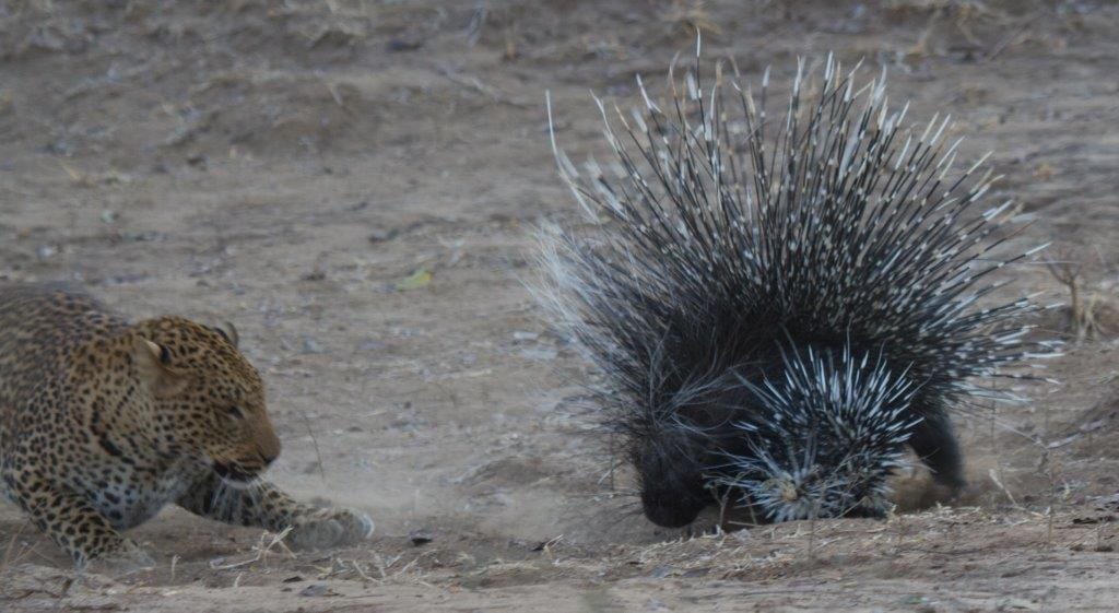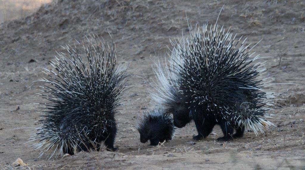 Actually, it was ‘porcupines’ in the plural … THREE, which we did not at first realise, as the third was about an eighth of the size of its parents. A little quill ball perfect in every way apart from the fact that a hungry leopard thought it would make an ideal snack.