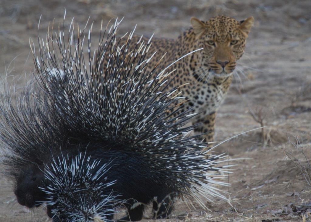 There in front of us was a most handsome yet hungry mature male leopard. He was sizing up his breakfast … porcupine!