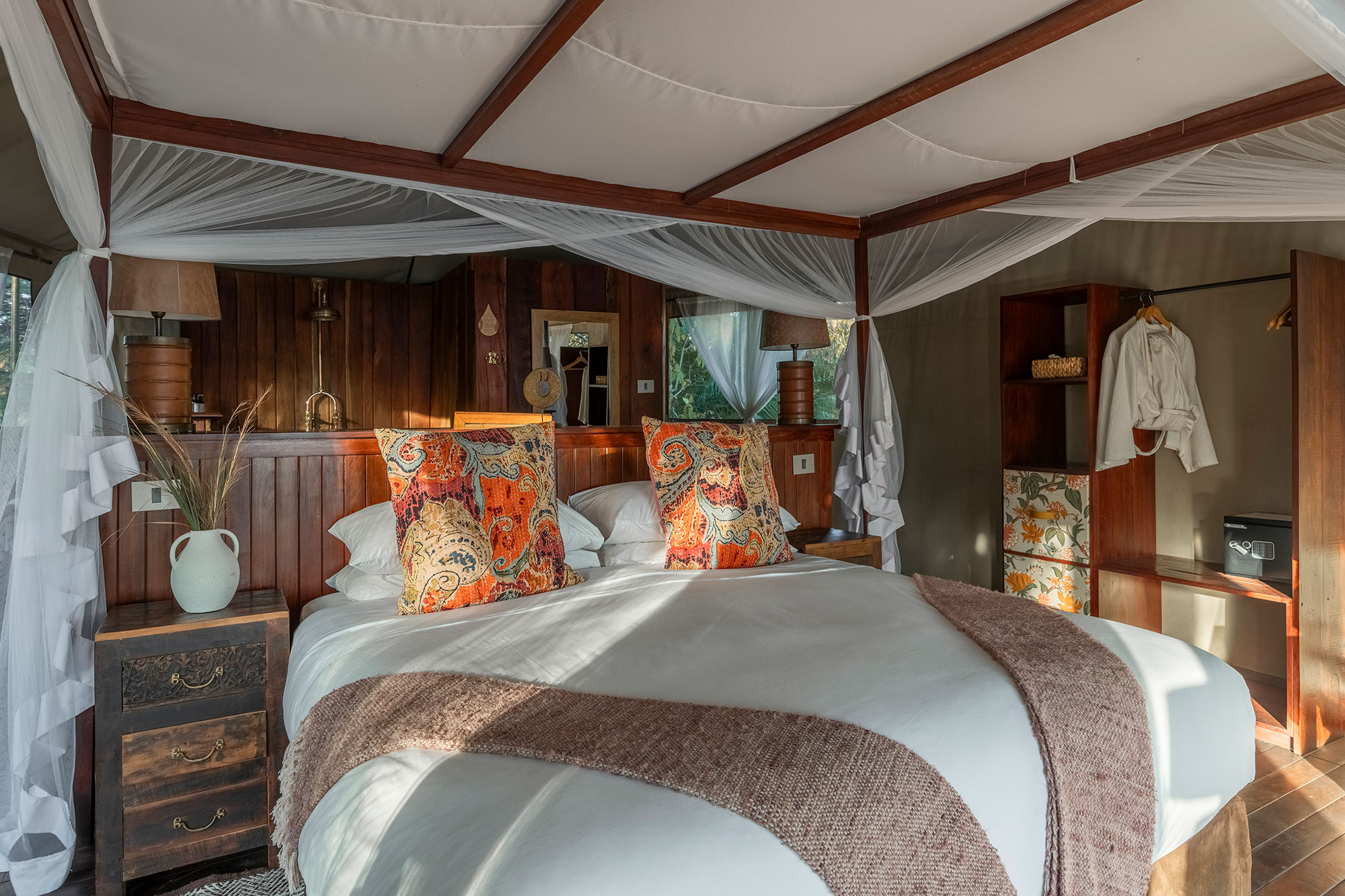 Two of the ten private luxury tents are perfect for families and feature an indoor bath, a shower, and two bedrooms separated by curtains.