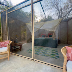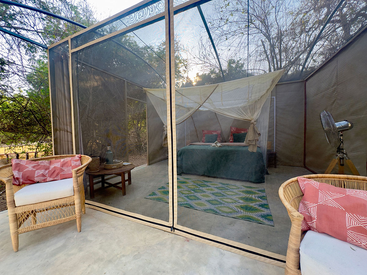 The defining feature of these chalets is their retractable roofs, allowing guests to choose when to sleep under the stars or enjoy shelter during the day. With gauze-wrapped walls and ceilings, the accommodation remains secure yet wonderfully open to the sights and sounds of the wild. Each unit can be configured with twin or king beds, and is equipped with standing fans, luggage racks, mosquito nets, and plug points. The en-suite bathrooms feature gauze ceilings and walls, open-air showers, and freestanding baths — all thoughtfully designed to enhance the close connection with nature.