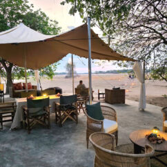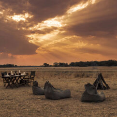 The camp’s communal areas include a relaxed dining and lounge space under a Bedouin-style stretch tent, perfect for sundowners, morning coffee, or quiet moments spent bird-watching or game-spotting. Nightly dinners are served under the stars on the floodplain.