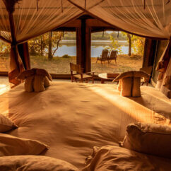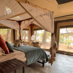 The safari tents offer a traditional bush-camp feel, with comfortable sleeping arrangements and convenient access to shared facilities.