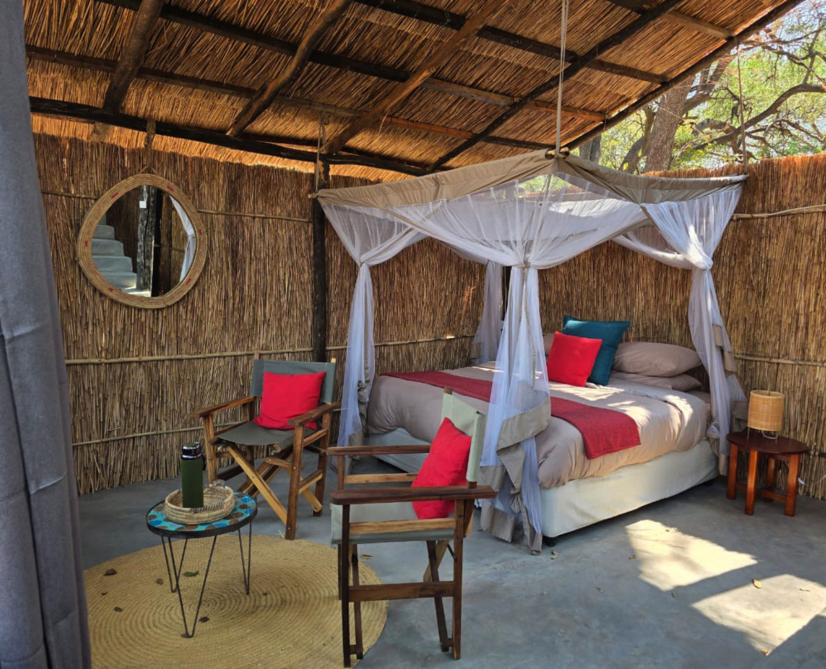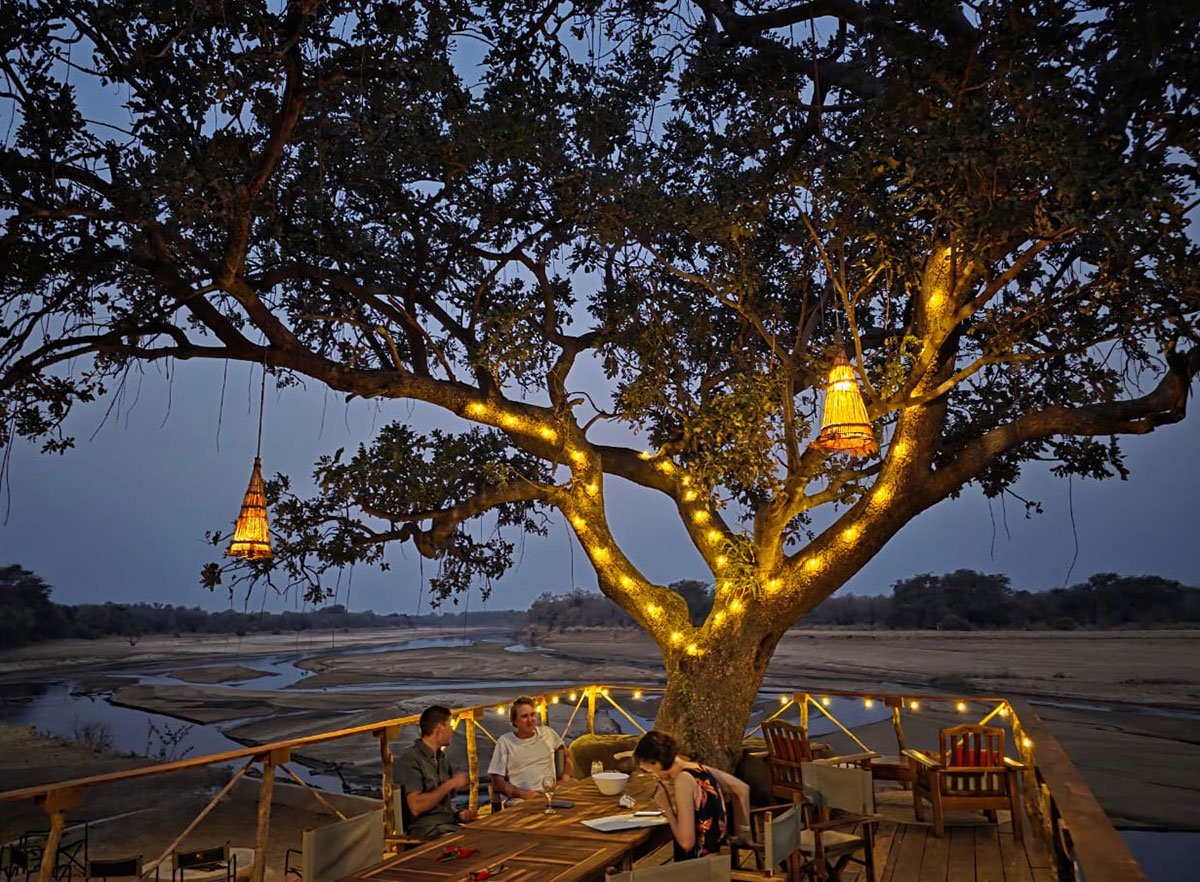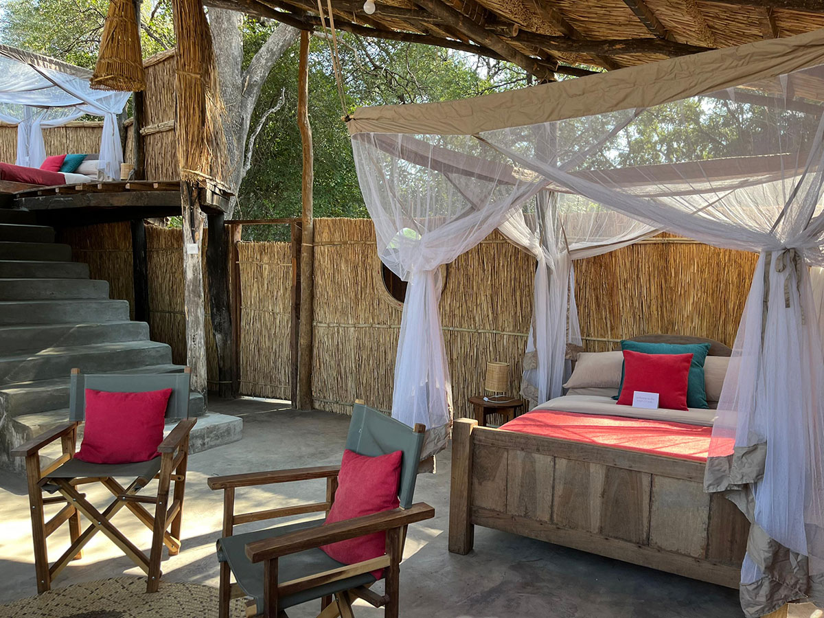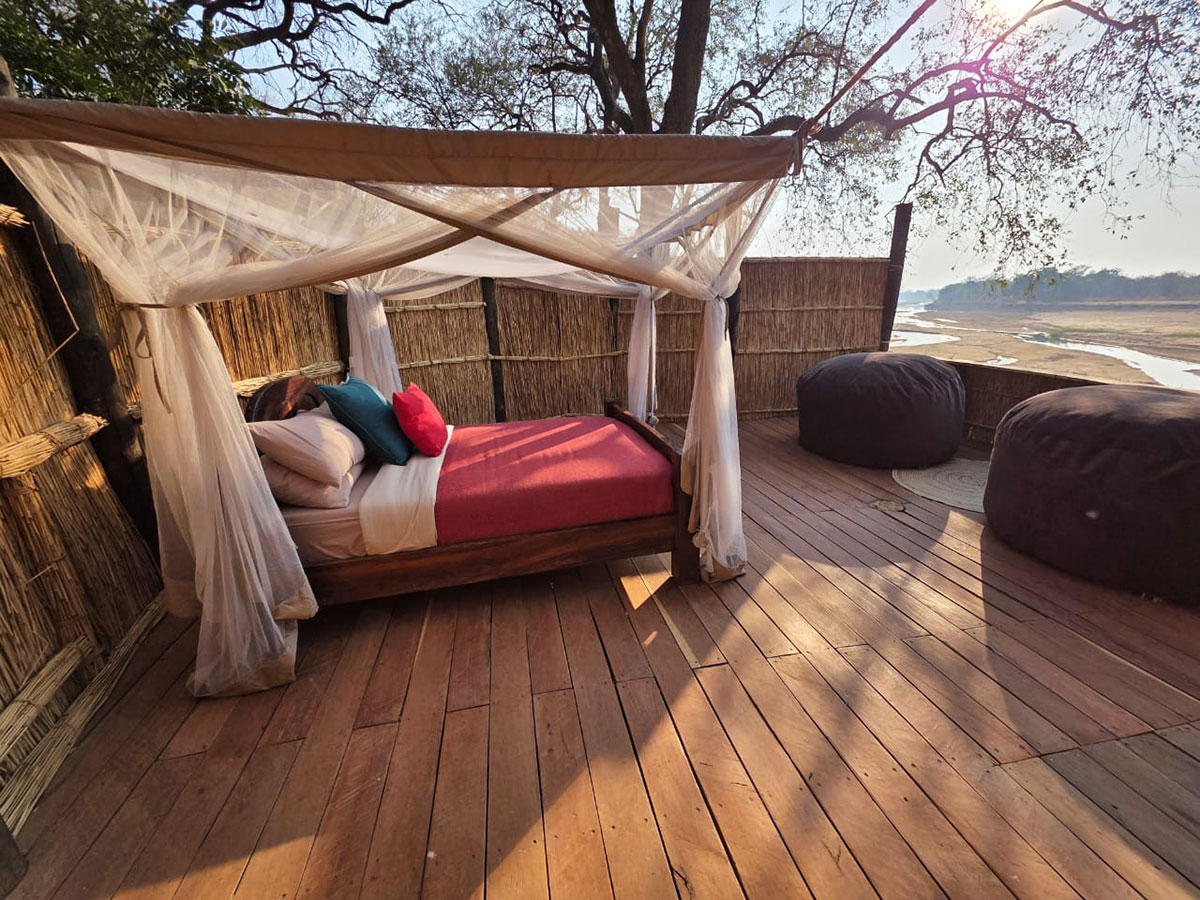 Each chalet features a large, comfortable bed mounted beneath a simple thatched roof, offering protection from the elements while remaining open on all sides. The design allows uninterrupted views of the night sky and surrounding bush, immersing guests fully in the sights and sounds of North Luangwa National Park. At night, wildlife can often be heard — and sometimes seen — moving through the area below.