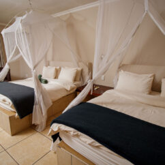 The camp consists of six chalets, entirely refurbished, with stunning furniture and soaring skylights. Each chalet features an outdoor bathtub along with en suite facilities. Private decks are overlooking the river offering uninterrupted views of game coming in to drink.