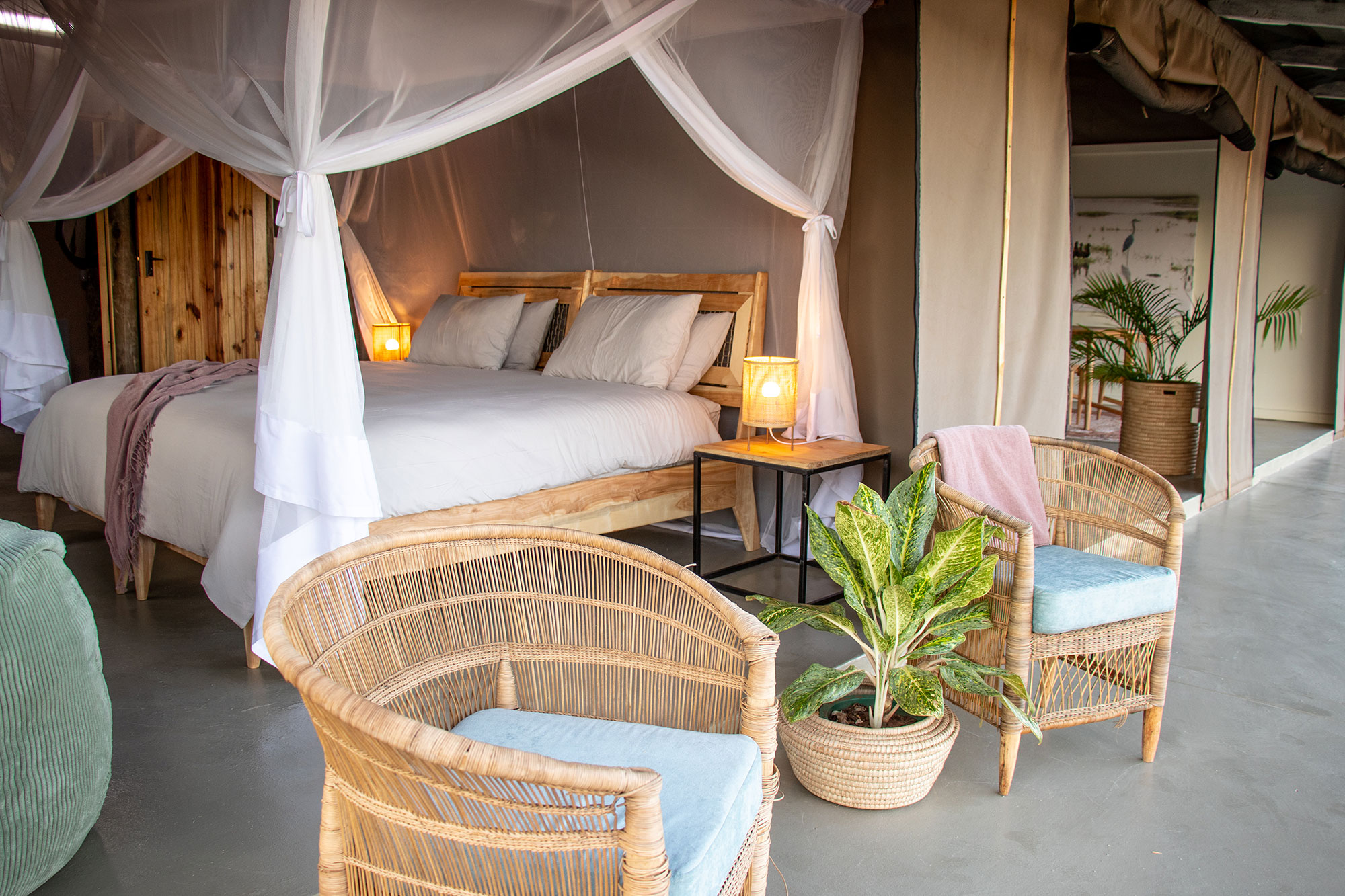 Each chalet is individually styled and features a spacious bedroom, en-suite bathroom, and a private veranda or deck overlooking the gorge. The open-fronted designs allow guests to feel fully immersed in the surrounding landscape, inspired by the Taita Falcon about to take flight.