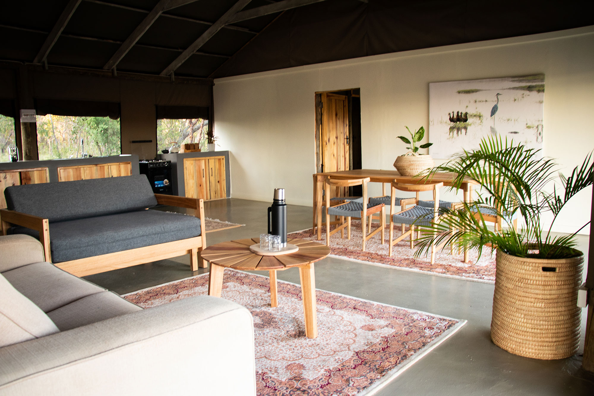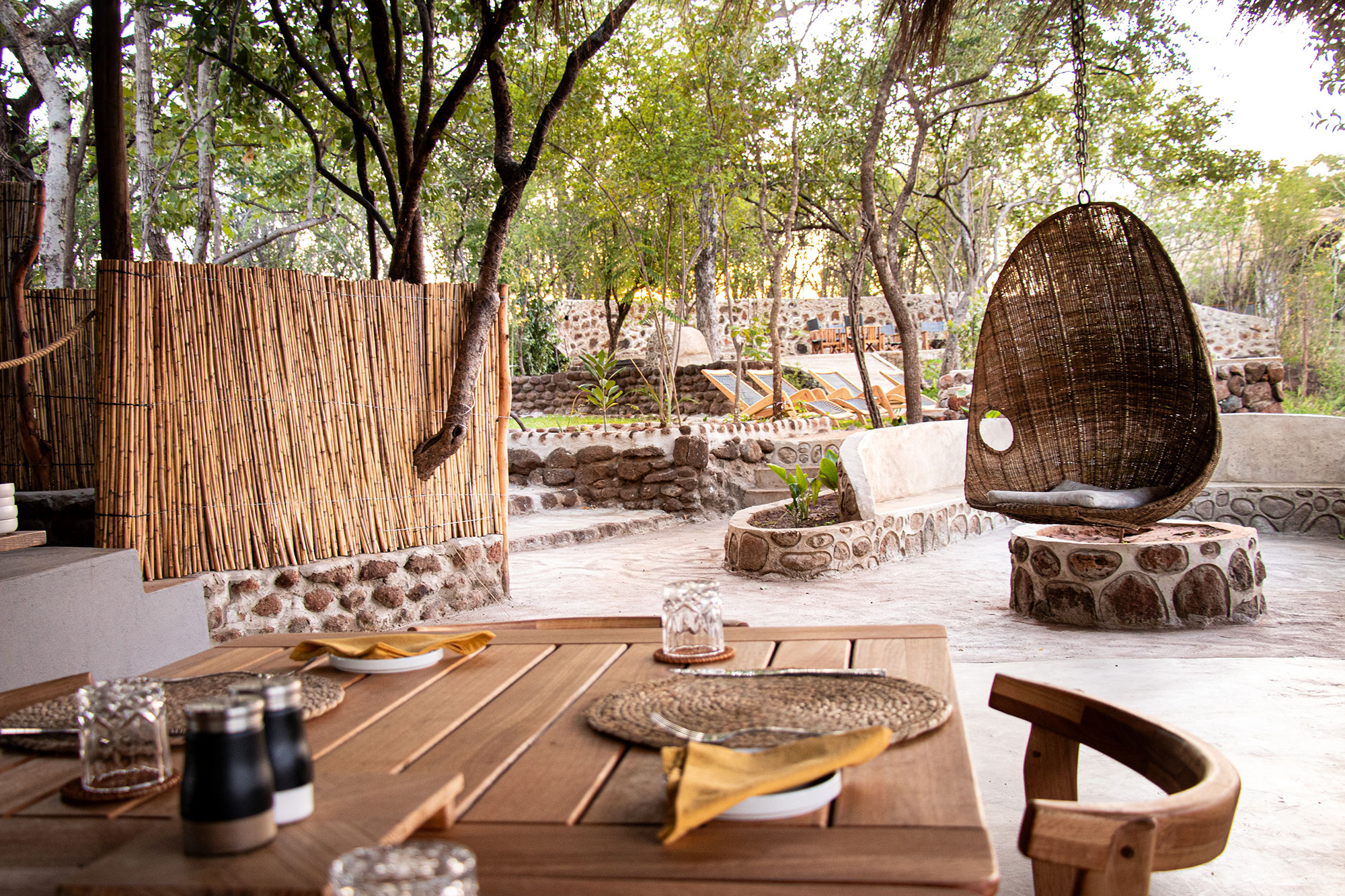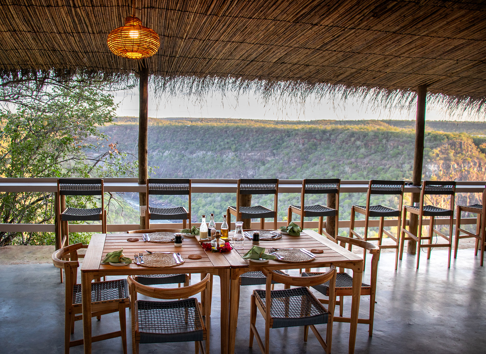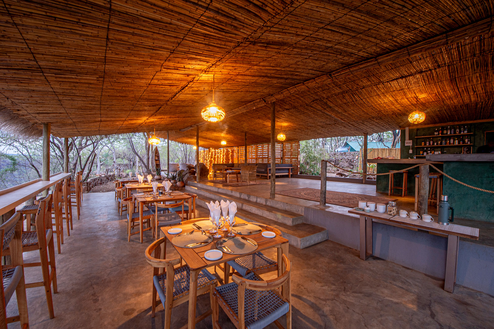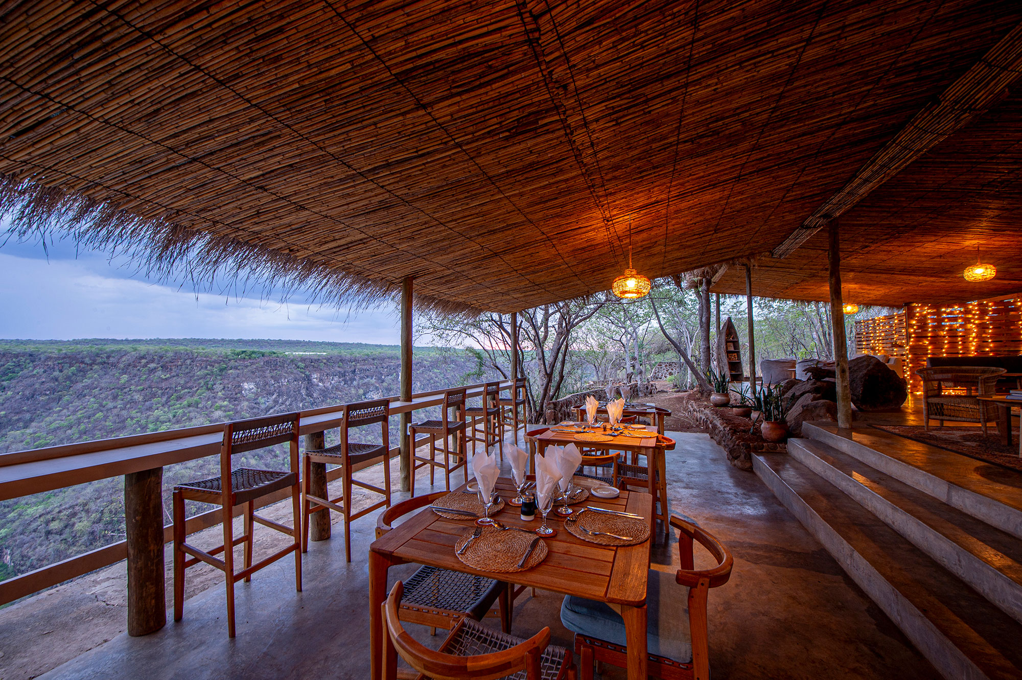 The main lodge area includes an open-sided lounge and dining space positioned on the cliff edge, creating a natural gathering point for meals or sundowners.