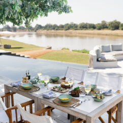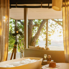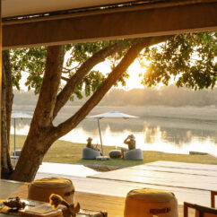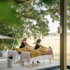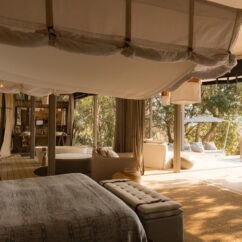 Six spacious luxury safari tents, including a two bedroom, two bathroom family tent, rest beneath mature msikizi trees. Each has a private plunge pool and a soaking tub, positioned for wide river views and the constant rhythm of wildlife moving along the water’s edge.