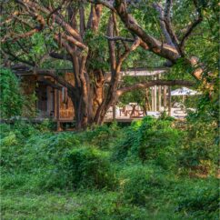 A winding path leads to the main lodge, where the riverfront sun deck invites long stretches with a book from the open air library. Evenings are unhurried, with dinners served under the stars using produce grown on site. Settle at the bar to browse old books and photographs, or gather around the fire pit high above the riverbank.