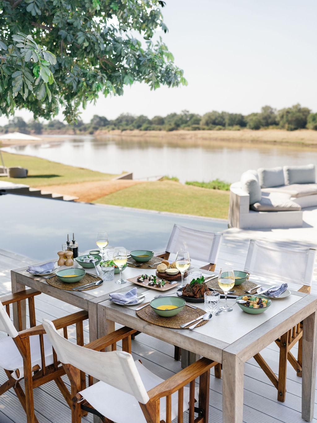 A winding path leads to the main lodge, where the riverfront sun deck invites long stretches with a book from the open air library. Evenings are unhurried, with dinners served under the stars using produce grown on site. Settle at the bar to browse old books and photographs, or gather around the fire pit high above the riverbank.