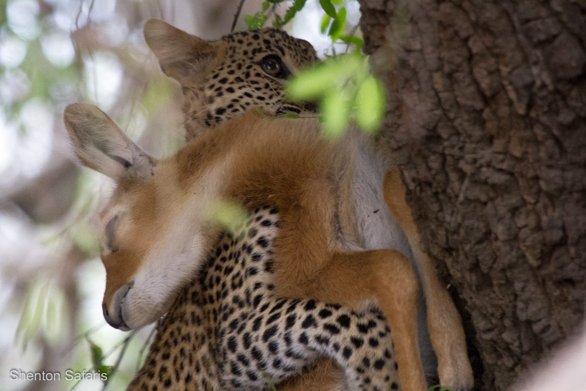 With Malika relaxing under a tree keeping a watchful eye on her little one, the cub proceeded to drag the small carcass up this tree. It seemed this was the first lesson she had in such activities judging by the sequence that followed. After she had placed the carcass in this tree, she would then climb back down to mum as if to tell her what she had done, but much to our amusement the puku would then fall from the branch and land right beside the mother and cub on the ground with a thud!