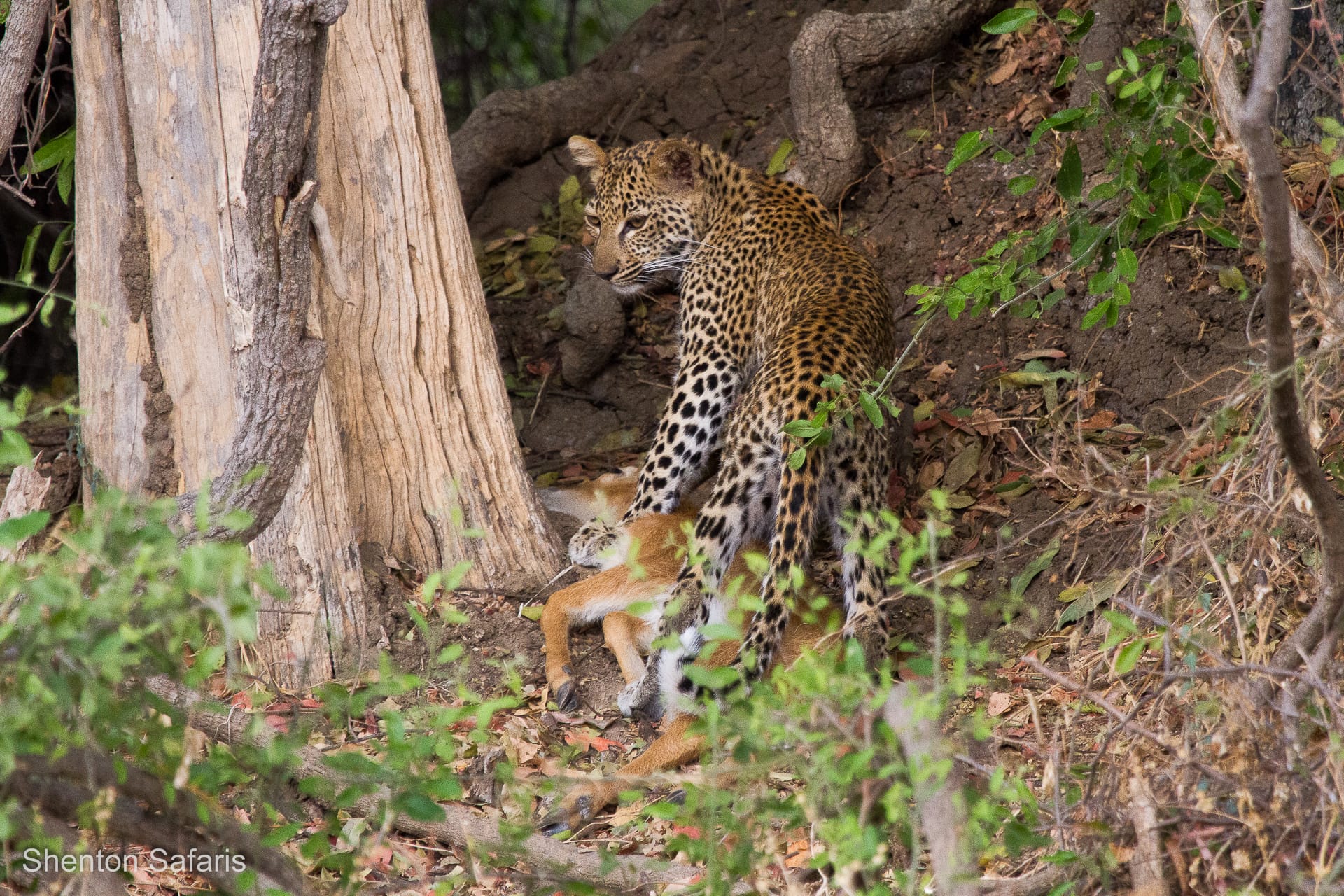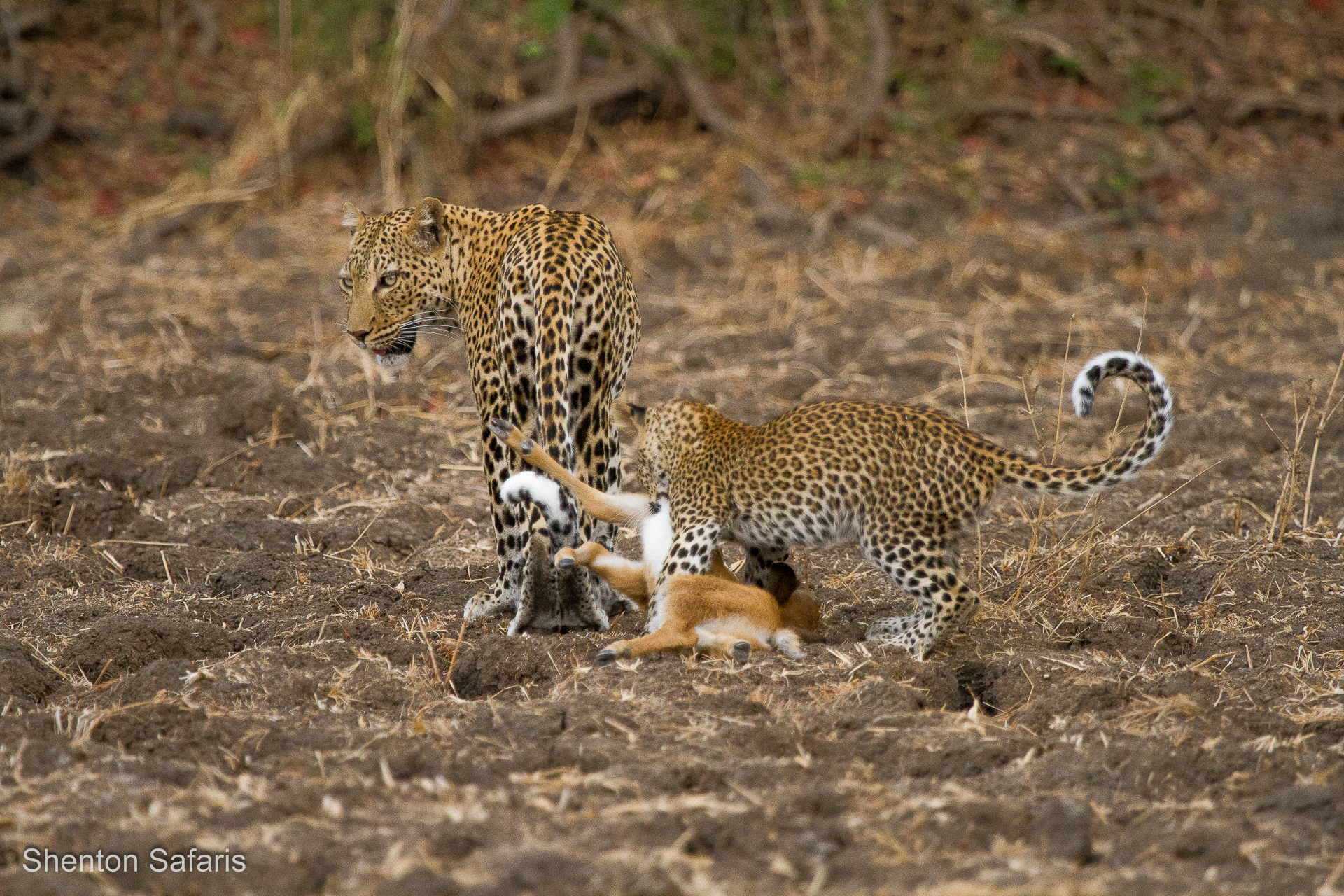 Our questions were quickly answered when we heard a rustling in the bushes closely followed by the cub. She was proudly dragging with her a very small puku. It was amazing to see the strength of such a small leopard! It was soon clear that what we were witnessing was her being given a lesson by Malika in how to hide and stash a kill to keep it safe from other predators and scavengers.