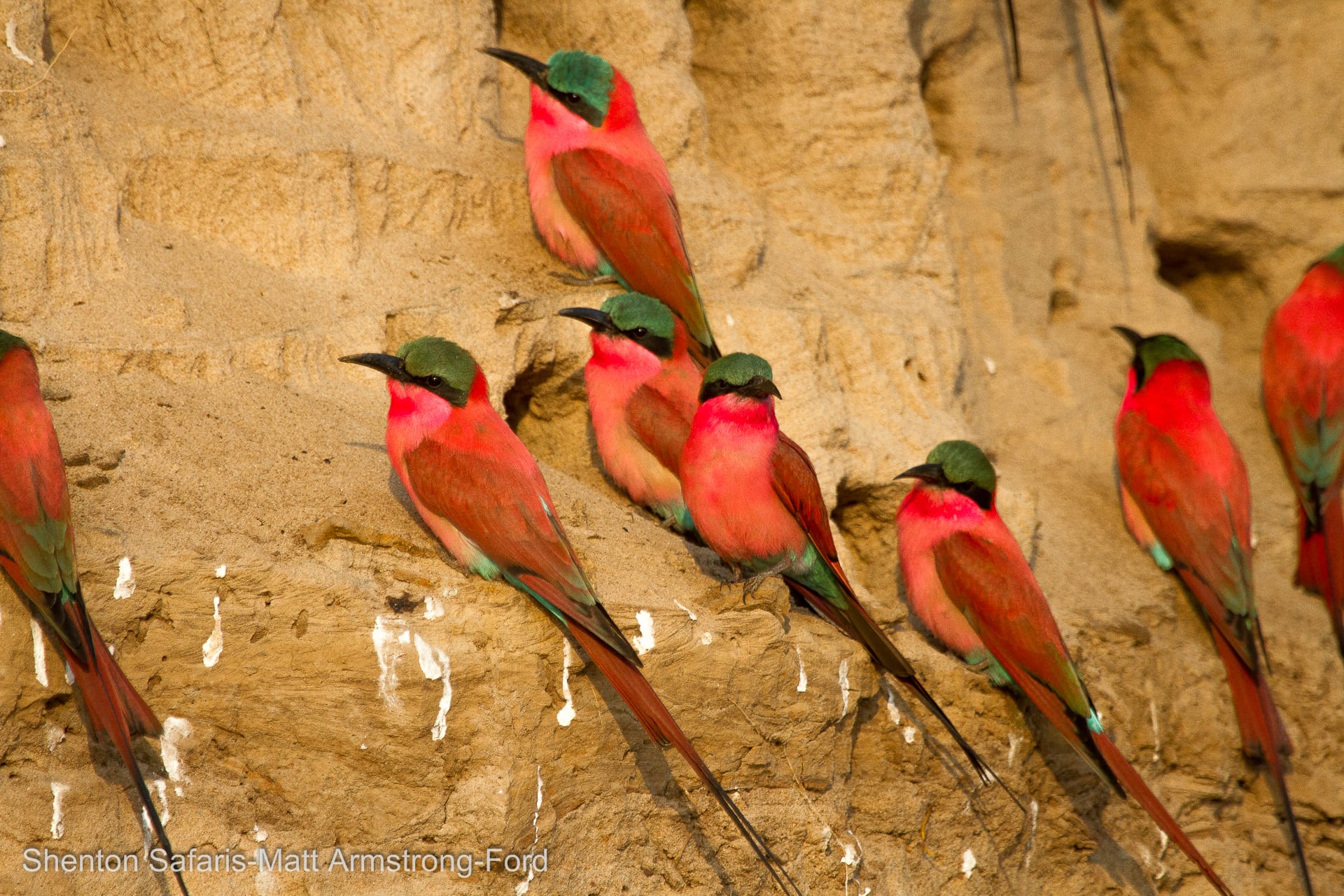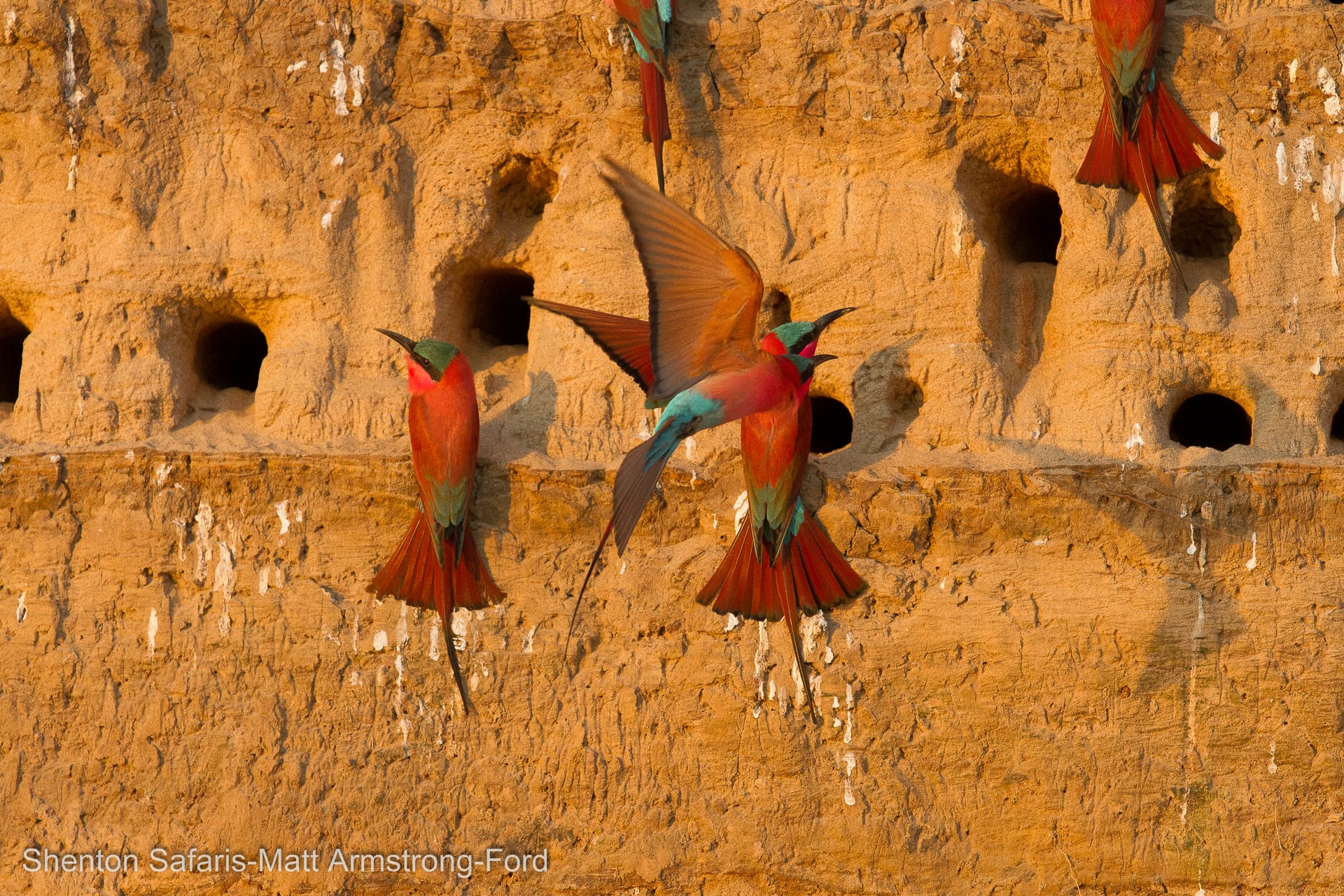 Carmine’s are one of seven species of bee-eaters we find in the South Luangwa and begin to arrive during mid-August coming from the southern coastline of Mozambique and its surrounding area. They come to this area for one purpose, for breeding. Once they have arrived they form monogamous breeding pairs and begin to excavate the nest tunnels which they build into the banks of the river – these tunnels are known to reach up to a meter deep with a small chamber at the back where an egg is laid.