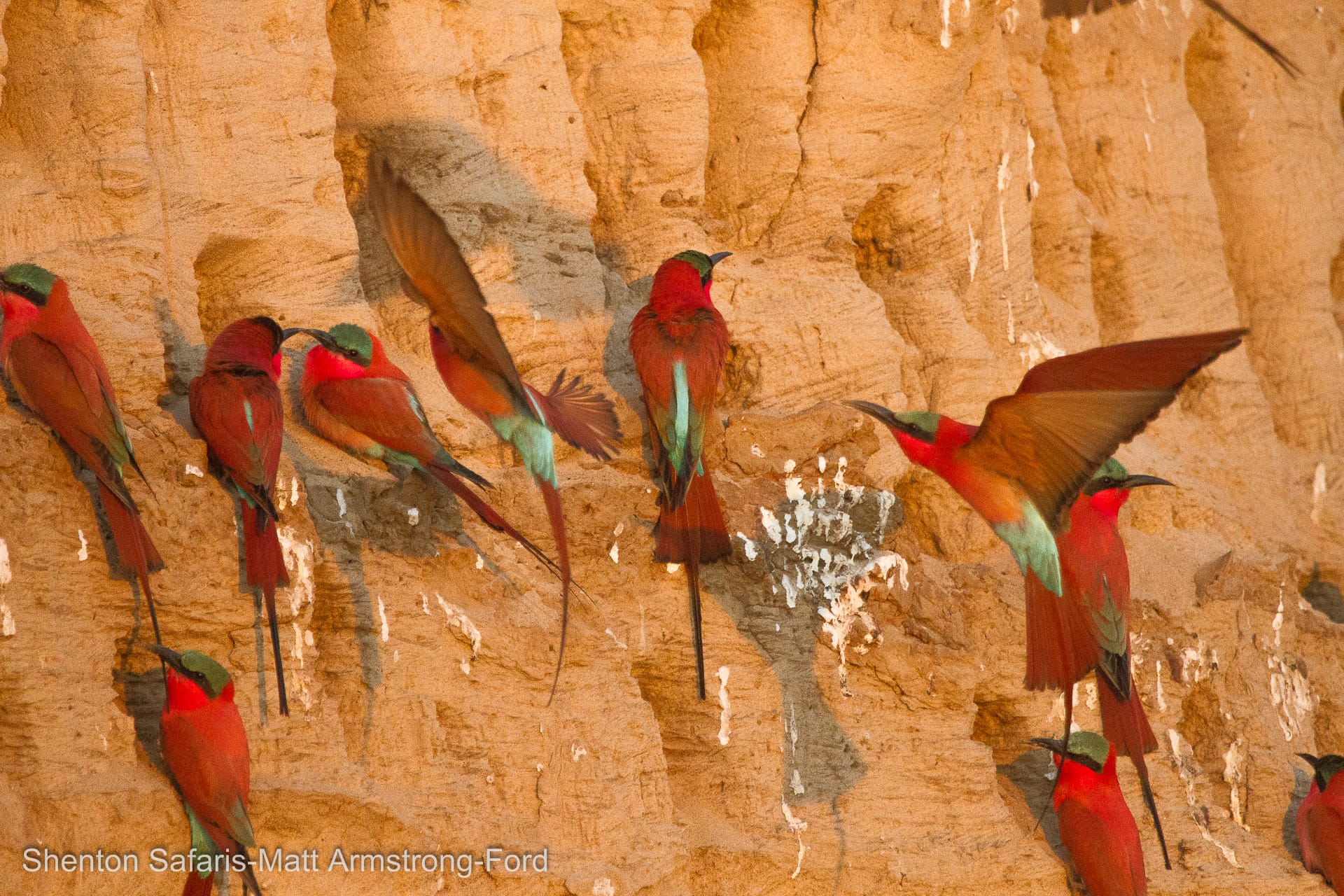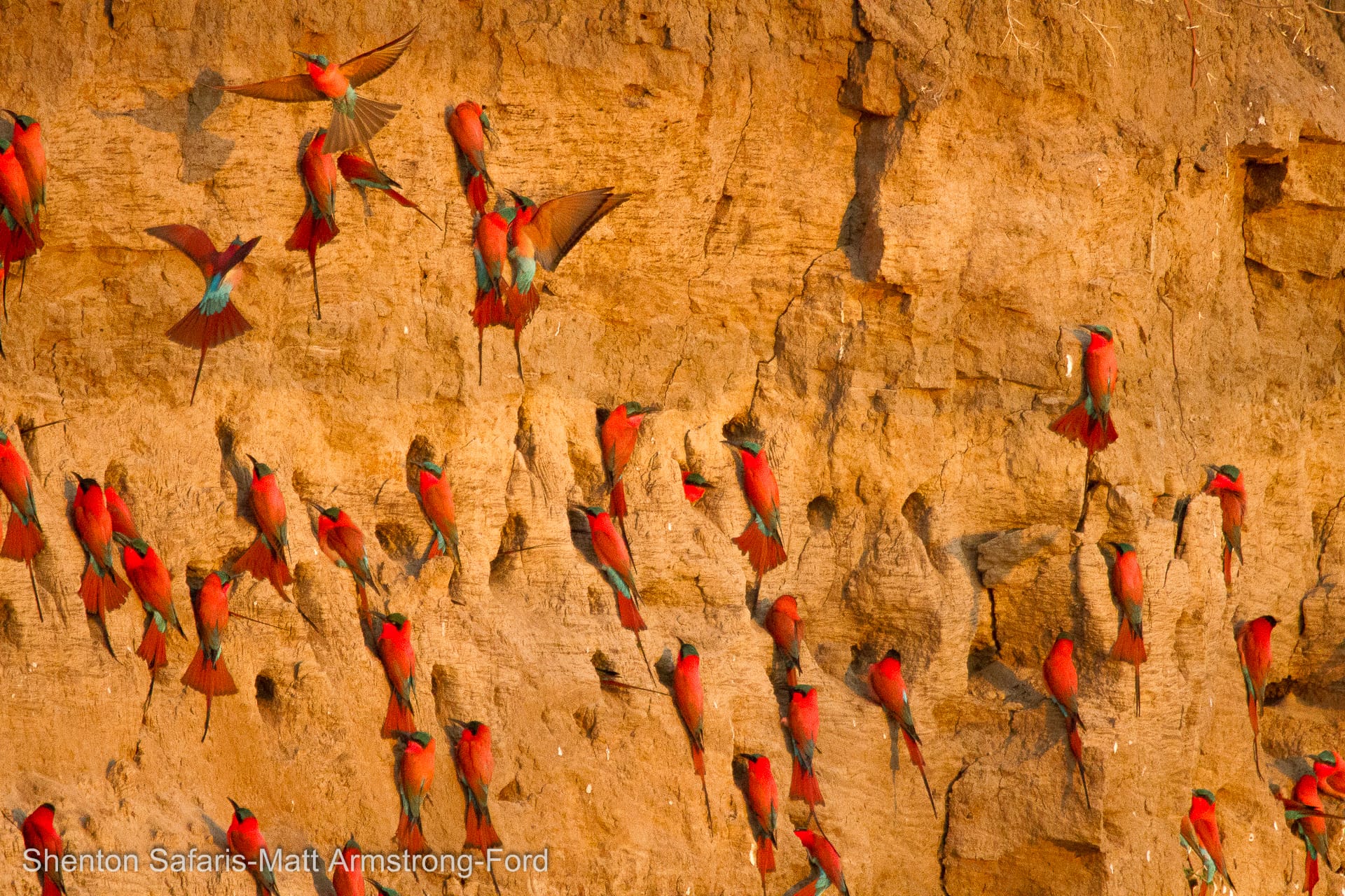 At Shenton Safaris we are very proud of our unique network of hides built and designed each year by Derek Shenton himself. Along with our mobile hide, elephant hide, hippo hide and Mwamba’s waterhole hide we also have our carmine bee-eater hide.