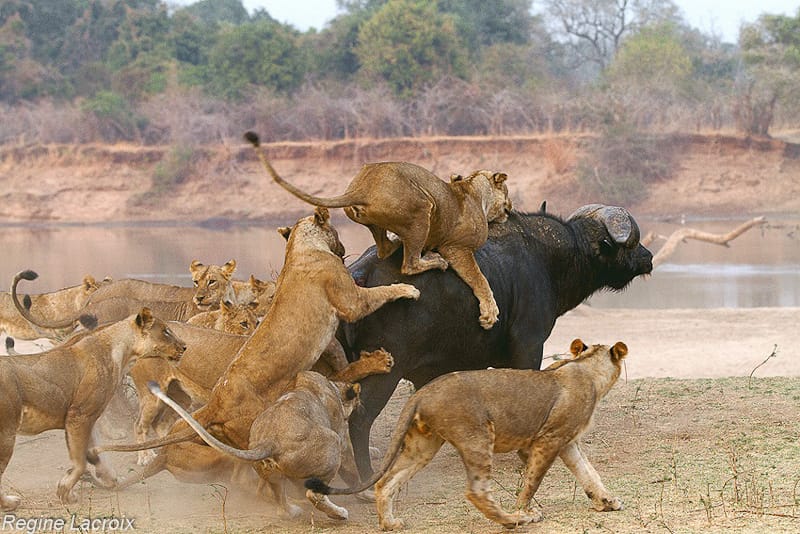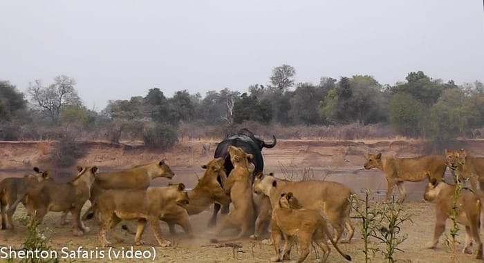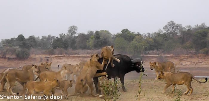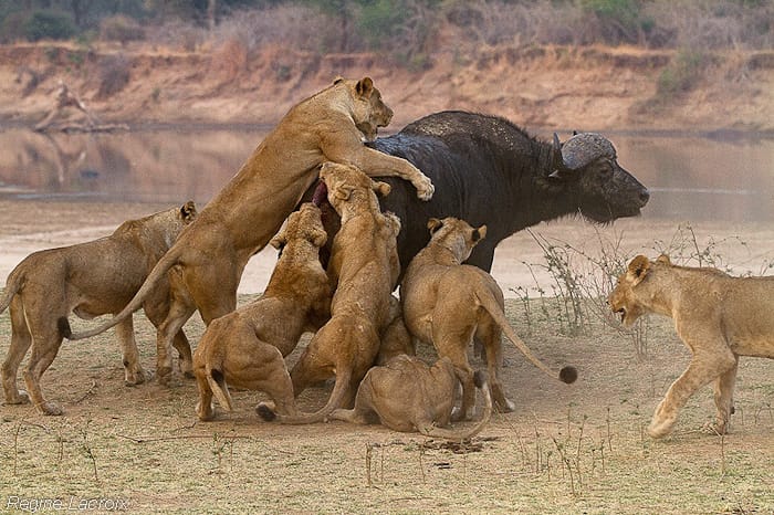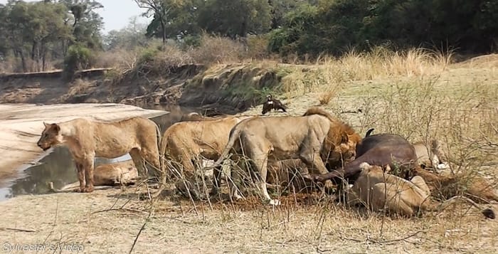 It was on a morning drive, just after 06h00, the guide was quick to spot the Mwamba-Kaingo pride, which totals up to 20 lions and cubs, that was stalking a buffalo. Buffalos are tough animals, and it requires several lions to work as a team to bring it down. But this time, it wall went fairly fast, and in no time was the buffalo down, and the gruesome scene of bloody and snarling lions began.