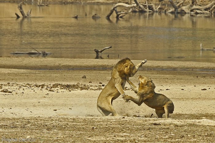 One of the two male from the Mwamba-Kaingo pride noticed it too, and immediately went after the intruder. He stalked him for about 200 meters of open sand beach, and was literally one meter away when the intruder noticed it, and the fight began. It was short lived, the intruder didn’t ask for more and fled, running along the beach, to finally cross again – oblivious to potentially lurking crocs!