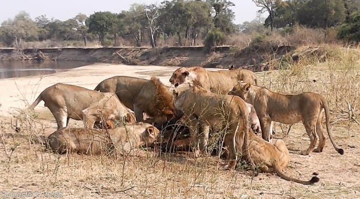 As just mentioned, with the season moving on, the bush getting drier and the water less available, the game concentrates towards the Luangwa River. And this becomes one of the preferred spots for lions, as prey is readily accessible. Numerous lion kills have been witnessed, but this particular one – of a buffalo – was quite special because not only was the actual kill observed from beginning to end, but it was followed by a very rare sighting of a fight between two male lions of rival prides.
