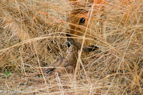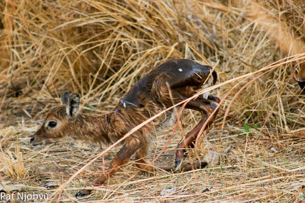 It was just before sunset, with the last rays of sun. It took about 20 minutes for the mother to drop her fawn, and for the young puku to struggle up its feet, and finally suckle. As for most antelopes, the babies have to be quick on their legs, to run away from predators and follow their mothers.